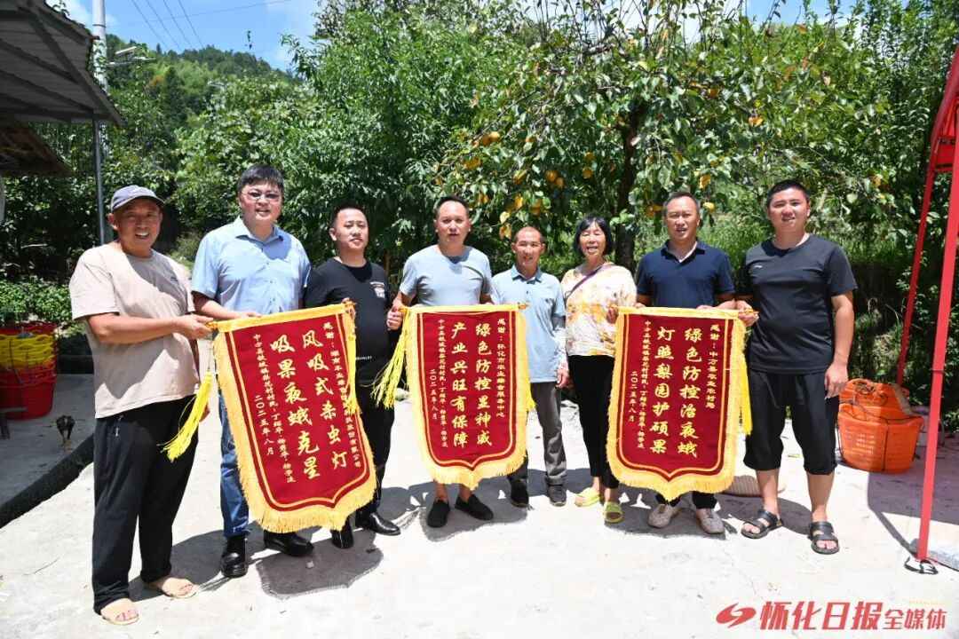 当日,村民丁绍华、杨秀华、杨学连在梨园前,将三面印有“绿色防控显神威,产业兴旺有保障”“绿色防控治夜蛾,灯照梨园护硕果”“风吸式杀虫灯,吸果夜蛾克星”的锦旗,分别赠予怀化市农业综合服务中心、中方县农业农村局、湖南本业绿色防控科技股份有限公司负责人手中,以表达心中最诚挚的谢意。