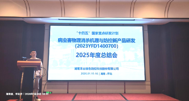 2026年1月14-16日,由湖南本业绿色防控科技股份有限公司牵头承担的“十四五”国家重点研发计划“物理消杀机理与防控新产品研发”项目2025年度总结交流会在怀化隆重召开。作为我国农业绿色防控领域的重要科研盛会,本次会议汇聚了项目各参与单位代表、权威专家及科研骨干,共同总结年度进展,共商技术创新方向,为推动农业病虫害物理防控技术发展注入新动能。